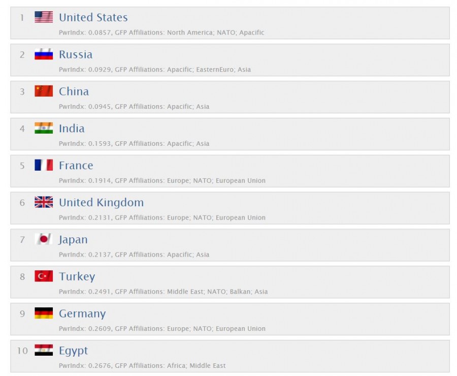 По итоговому показателю – рейтингу военной мощи – Соединенные Штаты в настоящее время заметно опережают Россию (второе место) и Китай (третье место). Далее в десятку ведущих военных держав мира, согласно докладу, входят: Индия, Франция, Великобритания, Япония, Турция, Германия и Египет.