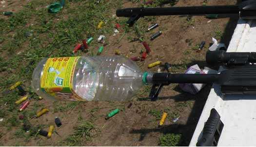 Простейший самодельный глушитель — обычная пластиковая бутылка, примотанная изолентой к стволу. В момент выстрела все пороховые газы окажутся в бутылке, а пуля, пробив донышко, вылетит наружу. Несмотря на громоздкость и снижение точности стрельбы, такой глушитель делает звук выстрела мелкокалиберным патроном не громче, чем треск от сломавшейся пластиковой линейки.