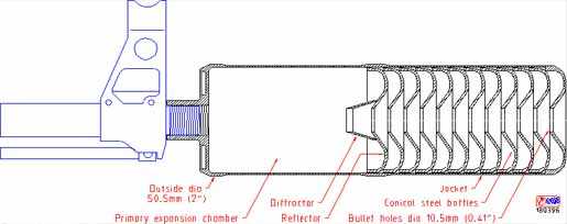 Достаточно типичный образец современного глушителя – отечественный ПБС, то есть «Прибор бесшумной стрельбы», который навинчивается на дульную часть ствола автоматов АКМ или АК-47. На некотором расстоянии перед дулом располагается толстая резиновая шайба. Опережающие газы задерживаются нею и через особые каналы направляются в расширительную камеру, откуда уже плавно вытекают в воздух. Когда пуля пронзает шайбу, основная часть газов следует за ней; но, последовательно пройдя через несколько расширительных камер, эти газы вырываются в атмосферу, потеряв значительную часть энергии. ПБС снижает громкость в 20 раз. Поэтому выстрел из АКМ практически не слышен уже на расстоянии 200 м. Живучесть ПБС без замены шайбы – до 200 выстрелов, что для специального оружия вполне приемлемо. Недостаток такой конструкции – старение резины, причем стареют ведь и запасные пробки – даже не используясь в глушителе. В настоящее время появилось буквально неисчислимое количество вариантов многокамерных устройств. Вот устройство одного из зарубежных глушителей на автомат Калашникова —