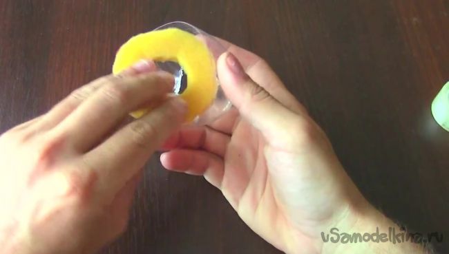 Закрепляем в донышке круглый кусок поролона с проделанным посередине отверстием, получив заглушку.