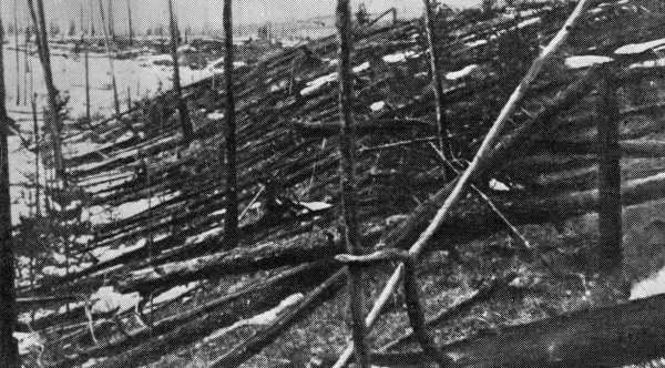 - В эпицентре деревья остались стоять, но напоминали полным отсутствием коры и ветвей телеграфные столбы, что еще раз подтвердило справедливость утверждения о надземном характере взрыва. Здесь же было обнаружено и заболоченное озеро, скрывавшее, по-мнению Кулика, воронку от падения космического тела.