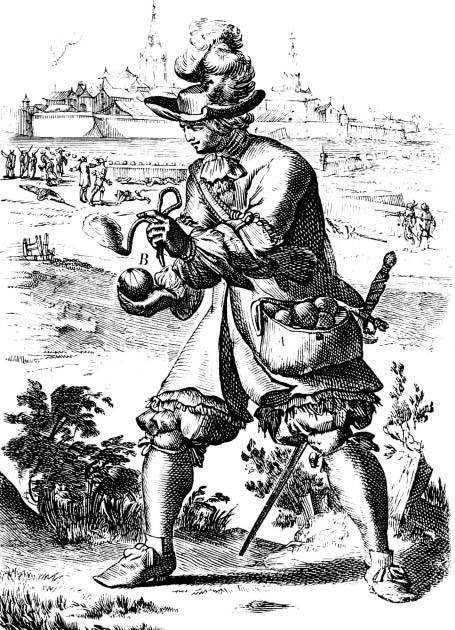 Он предлагал делать гранаты из меди, железа, дерева, стекла, глины и даже провощённого полотна. Деревянные и матерчатые шары требовалось покрывать слоем воска, вдавливать в него пули и затем снова покрывать воском. О снаряжении гранат говорится следующее: «Насыпь шар наполовину порохом и хорошенько встряхни его, затем положи несколько унций ртути и опять насыпь порох, чтобы шар совсем наполнить, наконец вставь затравку с огнивом в запальное отверстие».