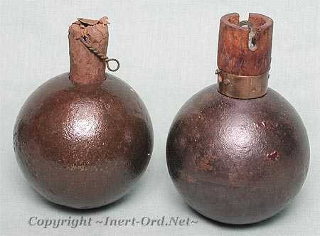 В XVIII-XIX веке гранаты делали из полых ядер небольшого диаметра, которые был в состоянии бросить человек на несколько десятков метров. Данные ядра заполнялись порохом, в отверстие ядра «очко» вставлялась запальная трубка и вуаля, граната готова. На фото французские ручные гранаты образца 1847 года с запалами образца 1882 года (слева) и 1914 года (справа).