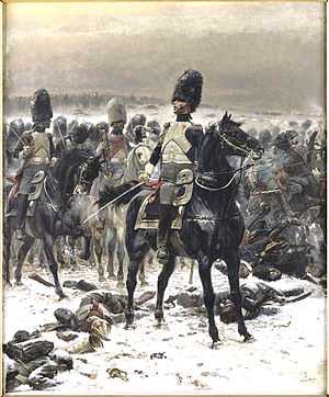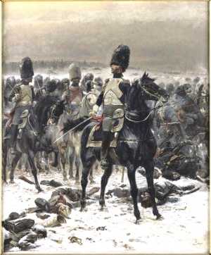 Французские гвардейские конногренадёры, 1807 год.Британских гренадёров и французских конногренадёров отличали парадные высокие медвежьи шапки.