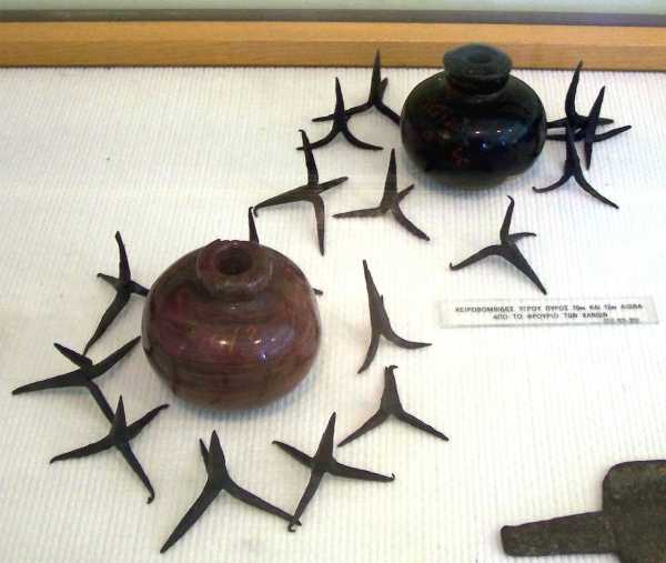 На фотографии ручные гранаты, заполняемые греческим огнем (X-XII век). Национальный исторический музей, Афины, Греция