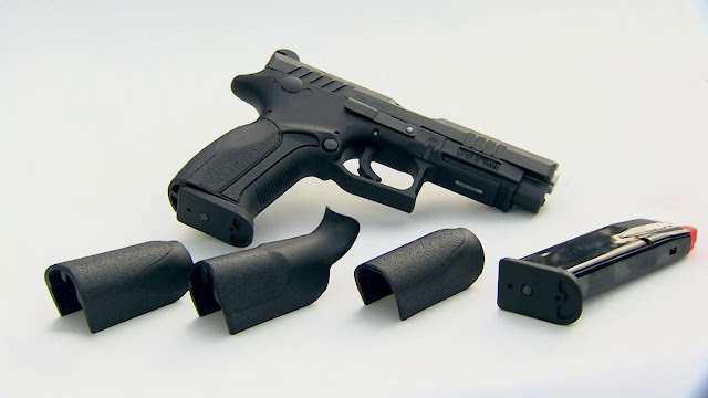 Появилась возможность установки съёмной мушки, смены задних панелей рукояти.