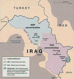 Division of Kurdistan after the civil warВ сентябре 1998 года Масуд Барзани и Джалал Талабани подписали мирный договор «Вашингтонское соглашение» при посредничестве США. В соглашении, стороны договорились поделить между собой доходы и власть, и дали запрет на использования северного Ирака РПК, и не позволять ввод иракских войск в курдские регионы. Соединенные Штаты обязались использовать военную силу для защиты курдов от возможной агрессии со стороны Саддама Хусейна. В то же время, реализация плана ООН «Нефть в обмен на продовольствие» принесла вклад в экономику северных районов Ирака, что позволило увеличить там уровень жизни. Иракский Курдистан стал сравнительно мирным регионом, пока террористическая группа «Ансар аль-Ислам» вошла туда в декабре 2001 года, в результате чего конфликт возобновился.