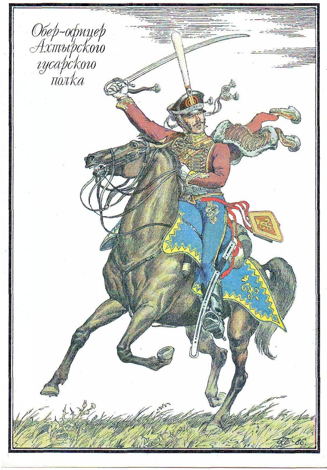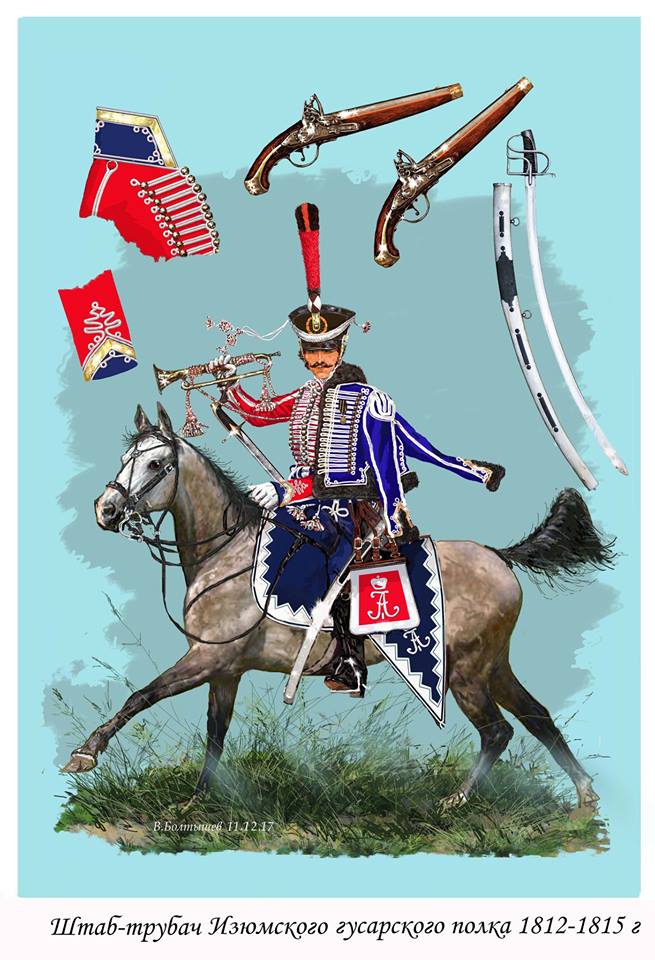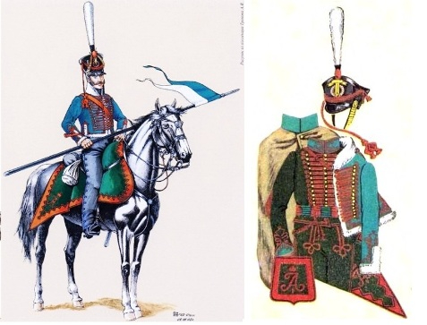 Штаб-офицер лейб-гвардии уланского Его Императорского Высочества Цесаревича Константина Павловича полка Л. Киль. Литогр. 1821.Мундир уланов (род легкой кавалерии) в русской армии был синего цвета, полки отличались цветом суконного (воротники, обшлага, лацканы, чепраки) и