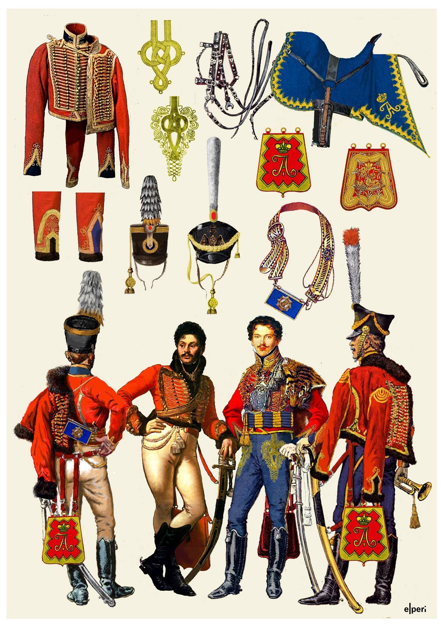 Форма и снаряжение гусар в Российской империи во многом заимствованы из элементов венгерской гусарской формы одежды и снаряжения, и включали в себя: