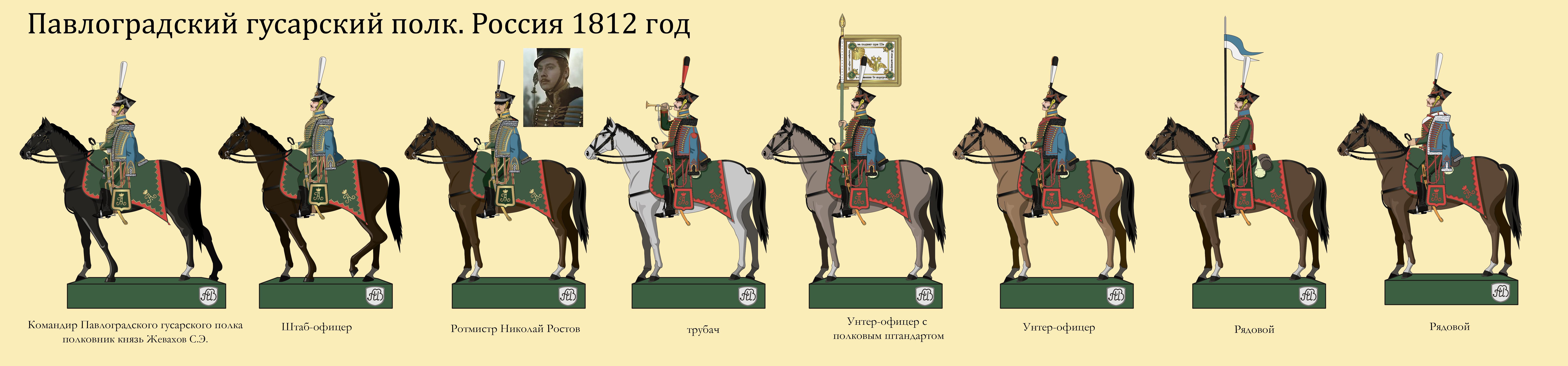 По штатному расписанию в гусарском полку было шесть эскадронов, 37 офицеров, 72 унтер-офицера, 14 трубачей, 834 рядовых. Всего 1032 человека и 972 строевые лошади.
