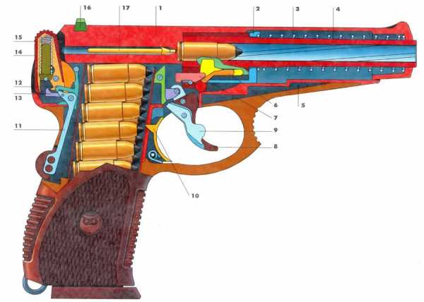 1-затвор, 2-упор возвратной пружины, 3-возвратная пружина, 4-ствол, 5-рамка в сборе, 6-замыкатель, 7-клин, 8-спусковой крючок, 9-передний предохранитель, 10-защелка магазина, 11-задний предохранитель, 12-шептало, 13-тяга, 14-курок, 15-боевая пружина, 16-целик, 17-ударник