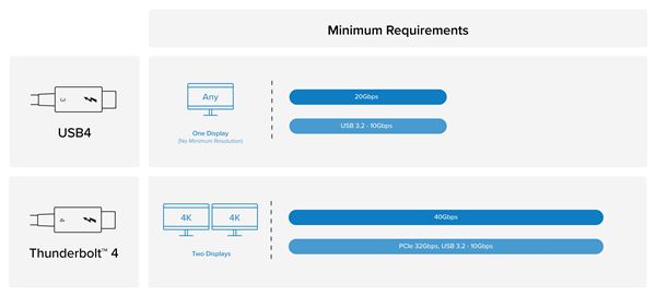 Ещё одним важным улучшением является то, что Thunderbolt 4 теперь поддерживает USB-концентраторы Thunderbolt Alternate Mode («много-портовая архитектура аксессуаров»), а не только последовательное подключение.