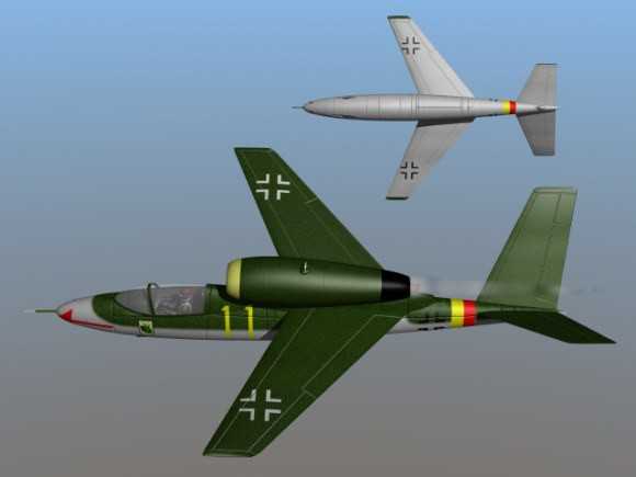 Но вот “FW-283” аналогов вообще не имеет – “торпеда” со скошенными крыльями и двумя реактивными “трубами” на хвосте, совсем как у позднейшего “Ту-154” (скорость 1150 км/час).