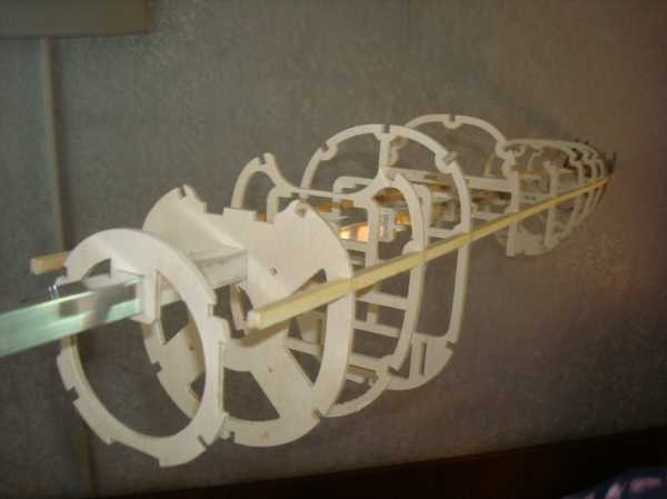 Фюзеляж собирал из фанерных шпангоутов на квадратной алюминиевой трубе-стапеле 12Х12мм. Шпангоуты толщиной 3,2мм. Стрингеры 5Х5мм из сосны и бальзы. Всё как обычно, ничего нового.