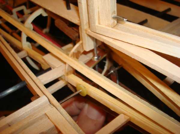 Киль и стабилизатор по аналогичной с крылом технологии. РН и РВ навешены на пластиковые петли. П-образная скоба из велосипедной спицы соединяет две половинки руля высоты. В середине к скобе припаян кабанчик из фольгированного стеклотекстолита. Таким образом тяга РВ идёт внутри фюзезяжа. Тяга сделана из деревянных палочек-шампуров диаметром 3мм. На концах при помощи ниток и циакрина прикручены стальные наконечники с резьбой М2, на которые наворачиваются шарниры. Тяга двигается внутри «рубашки» — трубочки для коктелей. Она закреплена на некоторых шпангоутах задней части фюзеляжа.