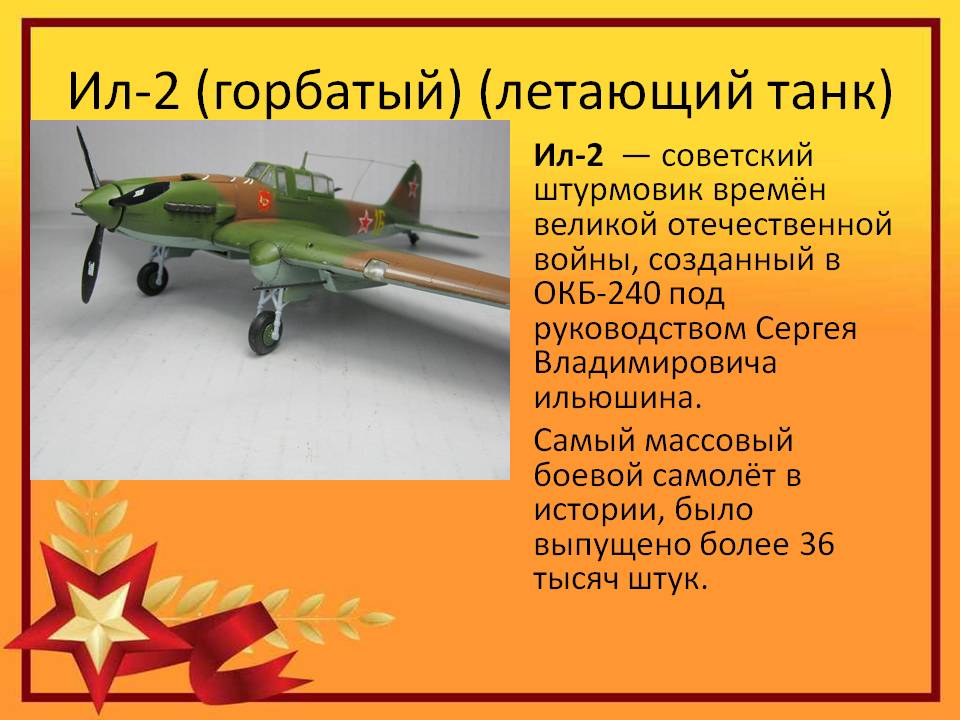 В конце войны Ил-2 стали заменять более совершенными штурмовиками Ил-10, но именно Ил-2, любовно называемые экипажами «ильюшами», «горбатыми», «летающими танками», вынесли на своих плечах основной груз боев. В 1941–1945 годах серийные заводы выпустили 36 163 «Ила».