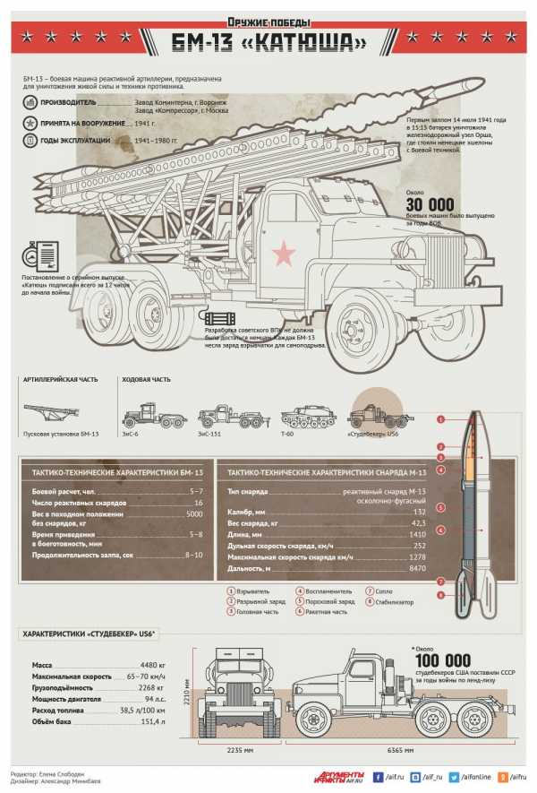 Наводившая на немцев хтонический ужас знаменитая «Катюша» начала создаваться еще в 1921 сотрудниками Газодинамической лаборатории Н. И. Тихомировым и В. А. Артемьевым как реактивное авиационное оружие. Реактивные снаряды РС-82 калибра 82 мм устанавливали на истребителях И-15, И-16, И-153. Летом 1939 года РС-82 на И-16 и И-153 успешно применялись в боях с японскими войсками на реке Халхин-Гол. В 1939—1941 годах сотрудники РНИИ И. И. Гвай, В. Н. Галковский, А. П. Павленко, А. С. Попов и другие создали многозарядную пусковую установку, смонтированную на грузовом автомобиле. Реактивный снаряд РС-132 калибра 132 мм и пусковая установка на базе грузового автомобиля ЗИС-6 БМ-13 были приняты на вооружение 21 июня 1941 года; именно этот тип боевых машин и получил впервые прозвище «Катюша». Впервые установки БМ-13 были опробованы в боевых условиях в 10 часов утра 14 июля 1941 года. Батарея капитана Флёрова обстреляла вражеские войска и технику в городе Рудня, поддержав обороняющиеся части Красной Армии. 16 июля они показали высокую эффективность при уничтожении неэвакуированных советских эшелонов на железнодорожном узле города Орша. С весны 1942 года реактивный миномет устанавливался преимущественно на ввозимые по ленд-лизу английские и американские полноприводные шасси. Наиболее известным среди них стал Studebaker US6. На протяжении Великой Отечественной войны было создано значительное количество вариантов снарядов РС и пусковых установок к ним; всего советская промышленность за годы войны произвела более 10 000 боевых машин реактивной артиллерии.