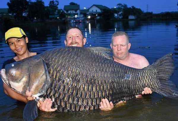 Во время отдыха в Таиланде британский рыбак поймал самого большого в мире сиамского карпа весом 105,2 кг. Взгляд мужика справа бесценен.