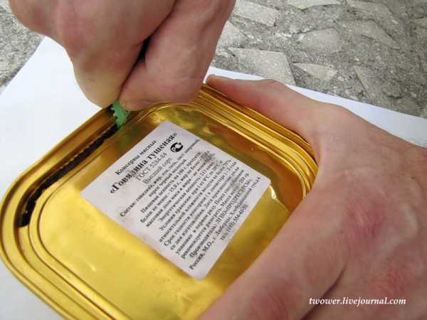 Вскрываю банки. Их, конечно, можно подогревать и в закрытом виде, но надо следить, чтобы банка не взорвалась из-за перегрева и потом неудобно вскрывать горячую. Поэтому предпочел открыть заранее. Банка с овощной икрой вскрывается проще — достаточно потянуть за уголок. Банка с плавленным сыром вскрывается еще удобнее.