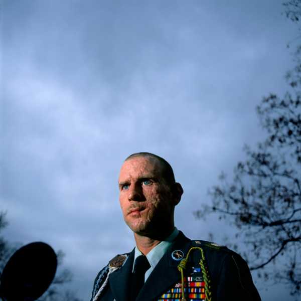Сержант 1-го класса Джозеф Моснер из 1-й бригады 1-й пехотной дивизии Армии США был тяжело ранен 16 декабря 2003 года при взрыве мины в Багдаде. Он лишился части лица, левого уха и скальпа. У него также были переломаны ноги, а в руки и в грудь попали многочисленные осколки. Фотография была сделана в базе Форт-Райли в Канзасе 9 апреля 2004 года.