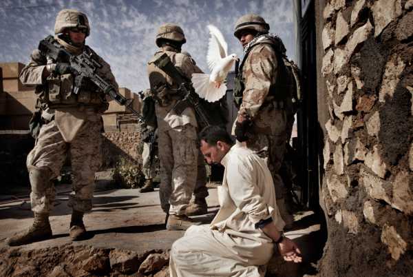 Солдаты 2-го батальона 1-го полка морской пехоты США и задержанный мужчина в городе Хусайба около ирако-сирийской границы 6 ноября 2005 года. У него пытаются узнать, где он находился во время проведения контртеррористической операции «Стальной занавес», в ходе которой проводилась зачистка города от повстанцев.