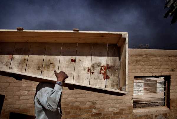 Работник багдадского кладбища Шейх-Мааруф несет гроб многоразового использования после похорон одинокой глухонемой женщины Нидаль Али Джасем, погибшей при взрыве ракеты на юге иракской столицы. 31 марта 2003 года.