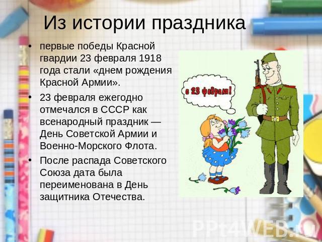 Нынешнее название — День защитника Отечества — у праздника появилось в 1995 году, с 2002-го этот день стал выходным.