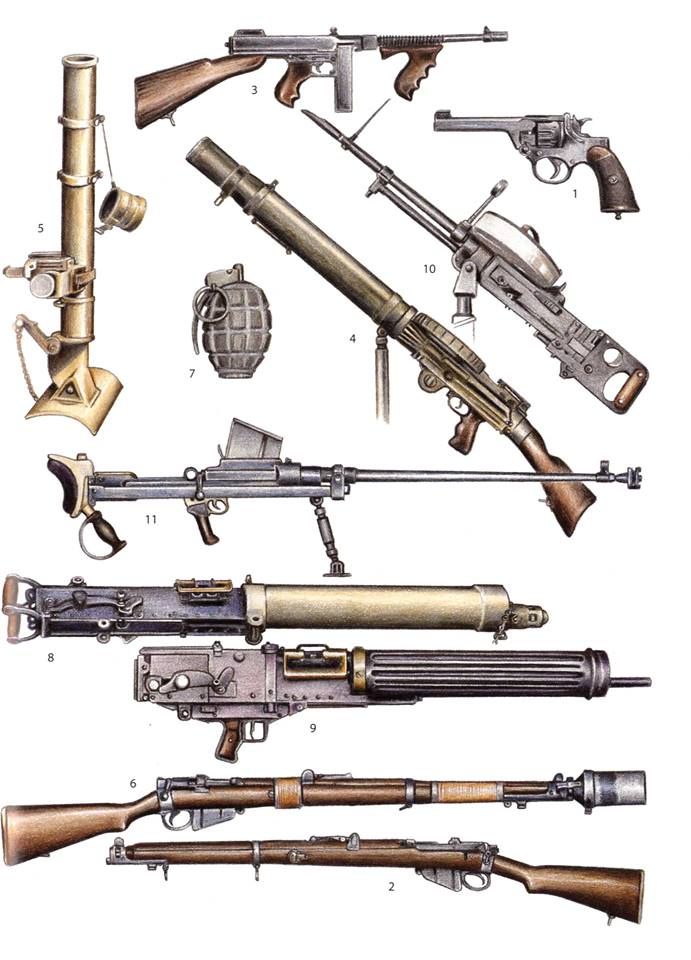 Эти усовершенствования включают такие виды оружия, как знаменитый «Томми-ган» или пулемет Томпсона, созданный Джоном Т. Томпсоном. Пистолет Томми на самом деле не был популярен, потому что он был изобретен после окончания Первой мировой войны и в основном использовался мафиози в бандитских войнах. Джон Томпсон был опечален, увидев оружие в таком виде, и так и не увидел его применения во время Второй мировой войны, поскольку он скончался в 1919 году.40.