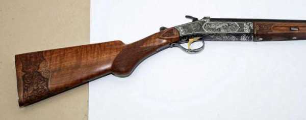 Двуствольное ружье имеет верхний ствол для патронов 16 калибра и один нарезной. Это удобно при охоте.