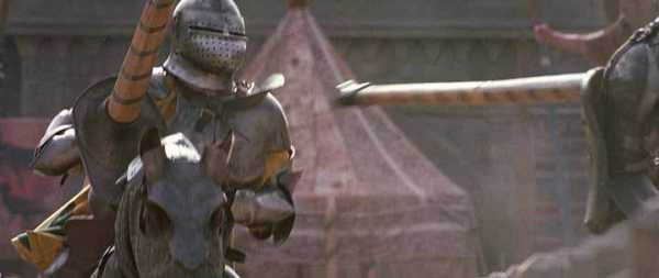 Турнир из кинофильма «История рыцаря» (2001 г). Судя по доспехам и общему антуражу, это даже не Столетняя война, а, по крайней мере, начало XVI века.