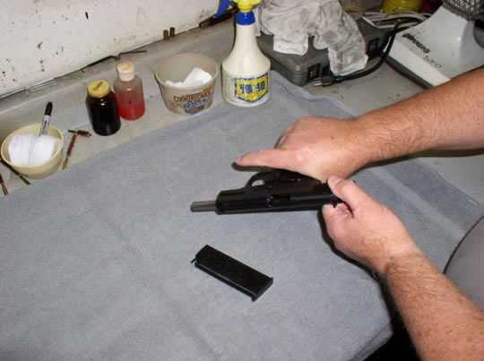 1. Разобрать и разрядить оружие. При этом в обязательном порядке отсоединить магазин, извлечь патроны, извлечь патрон из патронника, обязательно необходимо убедиться в том, что оружие полностью разряжено и убрать патроны подальше от места чистки.