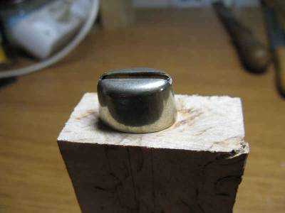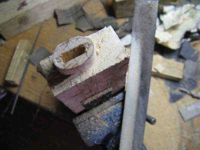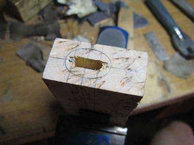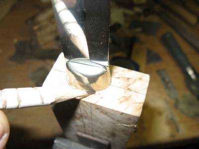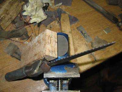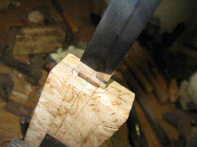Далее обтачиваем получившийся «зуб» до тех пор пока на него не сядет оковка. Чтобы между оковкой и рукоятью не было заметно щели. Я этого добиваюсь шлифовкой плоскости перпендикулярной деревянному «зубу» (на который одевается оковка). Берём крупный надфиль и выводим эту плоскость, не забываем постоянно примерять оковку и отмечать те места где надо снять лишнее мясо. Когда начнёте делать, всё сразу станет ясно.