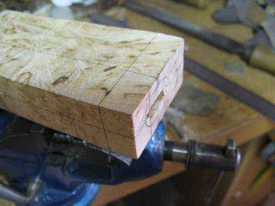 После этого отрезаем пилой все явно лишние части. Если вдруг сверло и ушло немного в сторону запас с каждой стороны позволит это скорректировать, мы просто перерисуем всю разметку и все, а не выбросим заготовку рукояти, но перебарщивать с этим тоже не стоит, совсем небольшого запаса хватит. С опытом можно будет сверлить заготовки прямо на весу без каких либо приспособлений и ничего не будет уходить.