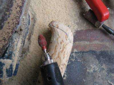 Доводим все сверлом проверяем как входит сам хвостовик, если все в порядке — переходим к следующему шагу. Берем средней зернистости шкурку и выравниваем плоскость к которой должен будет прилегать больстер. Следует отметить, что не следует на данном этапе прибегать к мелкозернистой шкурке, т.к. иначе клей за счет гладкой поверхности будет плохо прикрепляться к плоскости, в случае же с средней шкуркой образуются микробороздки и клей отлично держит.