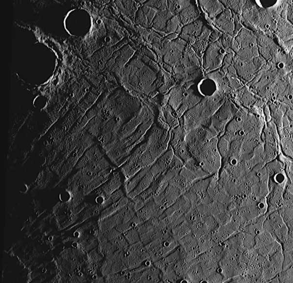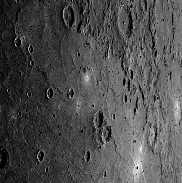 Поверхность Меркурия подверглась безумной космической бомбардировке. Большая часть планеты усеяна кратерами самых разных размеров.