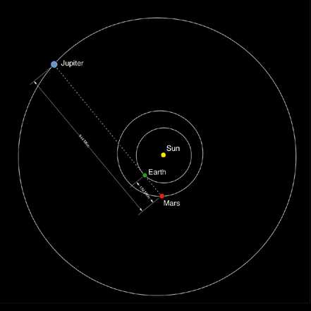 Вот так например Земля и Юпитер выглядели с орбиты Марса. Снимки были сделаны 8 мая 2003 года аппаратом Mars Global Surveyor, находившися на тот момент на расстоянии 139 миллионов километров от Земли. Стоит отметить, что камера на борту аппарата не могла делать цветных изображений, и потому это снимки в искуственных цветах.