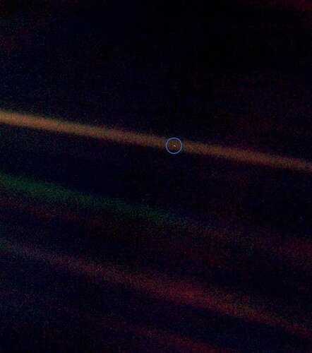 Cам Карл Саган так высказался об этом фото: «Взгляните ещё раз на эту точку. Это здесь. Это наш дом. Это мы. Все, кого вы любите, все, кого вы знаете, все, о ком вы когда-либо слышали, все когда-либо существовавшие люди прожили свои жизни на ней. Множество наших наслаждений и страданий, тысячи самоуверенных религий, идеологий и экономических доктрин, каждый охотник и собиратель, каждый герой и трус, каждый созидатель и разрушитель цивилизаций, каждый король и крестьянин, каждая влюблённая пара, каждая мать и каждый отец, каждый способный ребёнок, изобретатель и путешественник, каждый преподаватель этики, каждый лживый политик, каждая «суперзвезда», каждый «величайший лидер», каждый святой и грешник в истории нашего вида жили здесь — на соринке, подвешенной в солнечном луче.