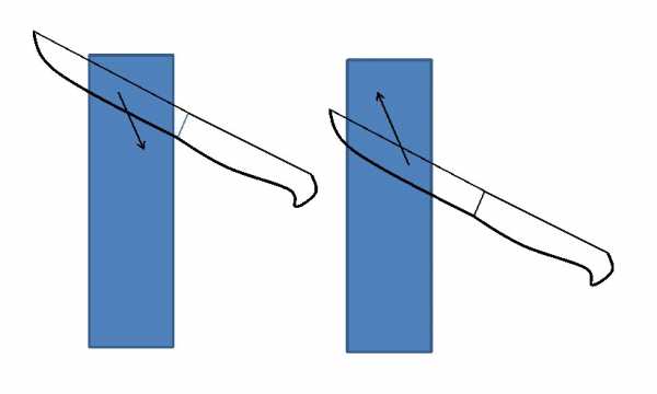 Заточка получается хоть и очень быстрой (несколько секунд), но очень несимметричной и недолговечной. Может подойти только в качестве аварийной заточки (ничего под рукой нет, а нож или топорик нужно срочно подточить). Кроме того, такая заточка на твердосплавных элементах портит режущую кромку и сильно снижает срок службы затачиваемого инструмента.