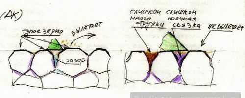 твердость шлифовального круга — это способность связки удерживать зерно в камне при воздействии на него внешних сил. слишком твердый круг долго держит в себе затупившееся зерно и вследствие этого возникает перегрев обрабатываемой поверхности. см. самый первый рисунок в статье. слишком мягкий круг быстро изнашивается.