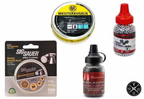 На фотографии представлены: слева — черные анодированные шарики «Hornady Black Diamond» и стальные шарики «Umarex 1500»; справа – профессиональные пульки «Meisterkugeln» матчевые пульки из сплава «Sig Sauer Match Ballistic».