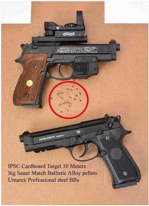 Серия из 16 выстрелов Beretta 92FS на дистанции 10м пульками из сплава « Sig Sauer Ballistic Alloy pellets» укладывается в круг 2,25 дюйма (5,7 см), а лучшие 5 – в круг 1,12 дюйма (28 мм). Такая же серия (16 выстрелов) из пистолета Beretta 92A1 стальными шариками «Umarex Professional» — в круг 2,5 дюйма (6,4 см), а лучшие 5 – в круг 0,625 дюйма (16 мм) – это лучше, чем лучшие 5 попаданий пульками из нарезного ствола!