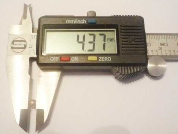 Проверяем также форму шариков, измеряя диаметр пули в разных положениях. Прибор показывает одинаковые цифры. Если шарик диаметром 4,38 мм, то он показывает это значение при разном поперечном измерении, что говорит о том, что пуля правильной сферической формы.