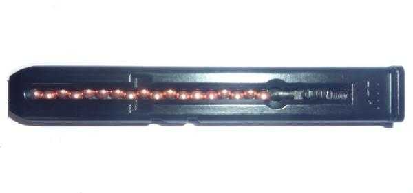 Беру зуль 4.4мм, беру шарик ВВ (номинально 4.5мм но обычно как раз в районе 4.45, но, как правило, не меньше). Кладу на дульный срез и пытаюсь утопить в ствол пальцем. ХРЕН ТАМ. Хотя в магазин, разумеется, лезут без проблем. Вывод — ежели я их пальцем запихнуть в ствол не могу, навряд ли с этим справится довольно слабая родная пружина. Потому рисковать и запихивать с казны не стал.
