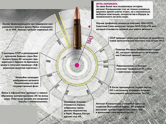 Автомат Калашникова был разработан в 1947 году, а в 1949 году его приняли на вооружение Советской армии. С тех пор АК претерпел несколько модификаций, последняя из которых, так называемая «сотая серия» (АК-101, АК-102, АК-103, АК-104, АК-105), появилась в 90-х годах. Автоматы Калашникова приняты на вооружение в 55 странах мира. Многие государства, включая КНР, производят «калашниковы» без лицензии.