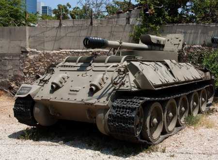 Так же на базе танка Т-34 египтяне создали смешную самоходную установку. Гаубица Д-30 калибра сто двадцать два миллиметра стоит задом на перёд. Впрочем это очень удобно при отступлении.