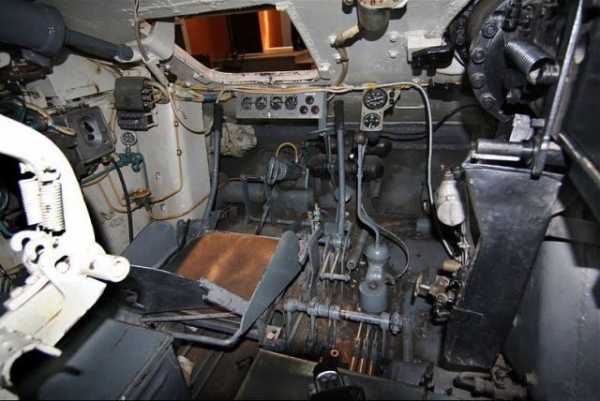 Вид на место механика-водителя с боевого отделения. Люк открыт. Под правым рычагом можно рассмотреть баллоны со сжатым воздухом, которые использовались для запуска двигателя