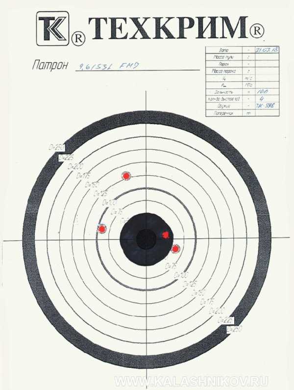 Менее заметное, но самое важное отличие — холодно-кованный ствол калибра 9,6/53 Lancaster. Канал ствола имеет хромовое покрытие, такое привычное для отечественных пользователей. Это обеспечит многолетнюю надёжную эксплуатацию оружия. Потенциал кучности стволов полноценно оценивать ещё рано — слишком мало времени прошло с момента появления калибра, не все виды патронов поступили в продажу. На иллюстрации приведена мишень отстрела патронов серийной партии с пулей FMJ 15 на дистанции 100 м из положения сидя с упора.