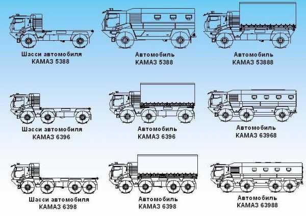 — КАМАЗ-5388. Шасси с колесной формулой 4х4. Предназначено для монтажа бортового кузова, кранов, мультилифтов и другой техники, не требующей защиты;