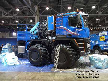 Трехосный вездеход с колесной формулой 6х6 уже был официально представлен ранее. Он оснащен традиционной КАМАЗовской кабиной и имеет две комплектации: «габарит» и «негабарит».