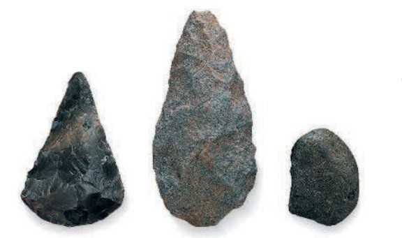Неандертальцы и Homo sapiens гораздо лучше умели делать орудия, чем их предшественники. Они оббивали куски кремня для получения ручных топоров (слева и посередине) и рубящих орудий (справа). Ручные топоры остроконечной или овальной формы применялись в самых разных целях.